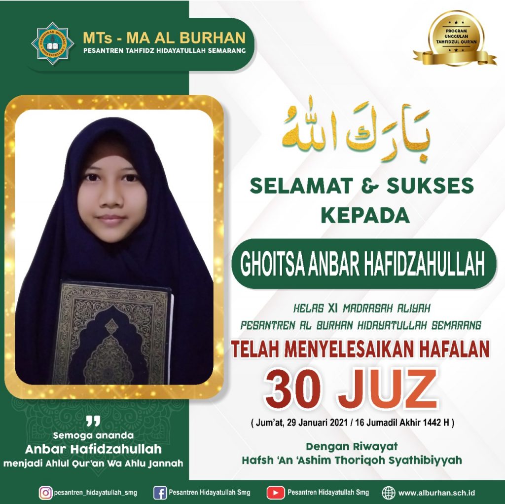 Barakallah, Santri Putri Al Burhan Hidayatullah Semarang Telah Menyelesaikan Hafalan 30 Juz.